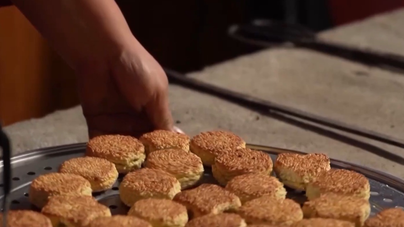 与此同期,另一户东说念主家则忙着制作缙云烧饼,揉面、调馅、贴炉,一气呵成。跟着炉火烘烤,烧饼逐步延迟,名义泛起诱东说念主的金黄,芝麻在饼面上散漫出阵阵香气。