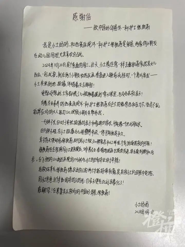 小土的家东说念主还送了一封感谢信到张凯莉的科室。杭州市西溪病院外一科照应长汤佳媚说:若不是本日收到的这封信,全科东说念主齐不会知说念,在科里一向温婉固执的张凯莉,闷声干了这样一件大事!张凯莉用她的本色看成,呈现了全力赞成人命的行状操守和细致医德。