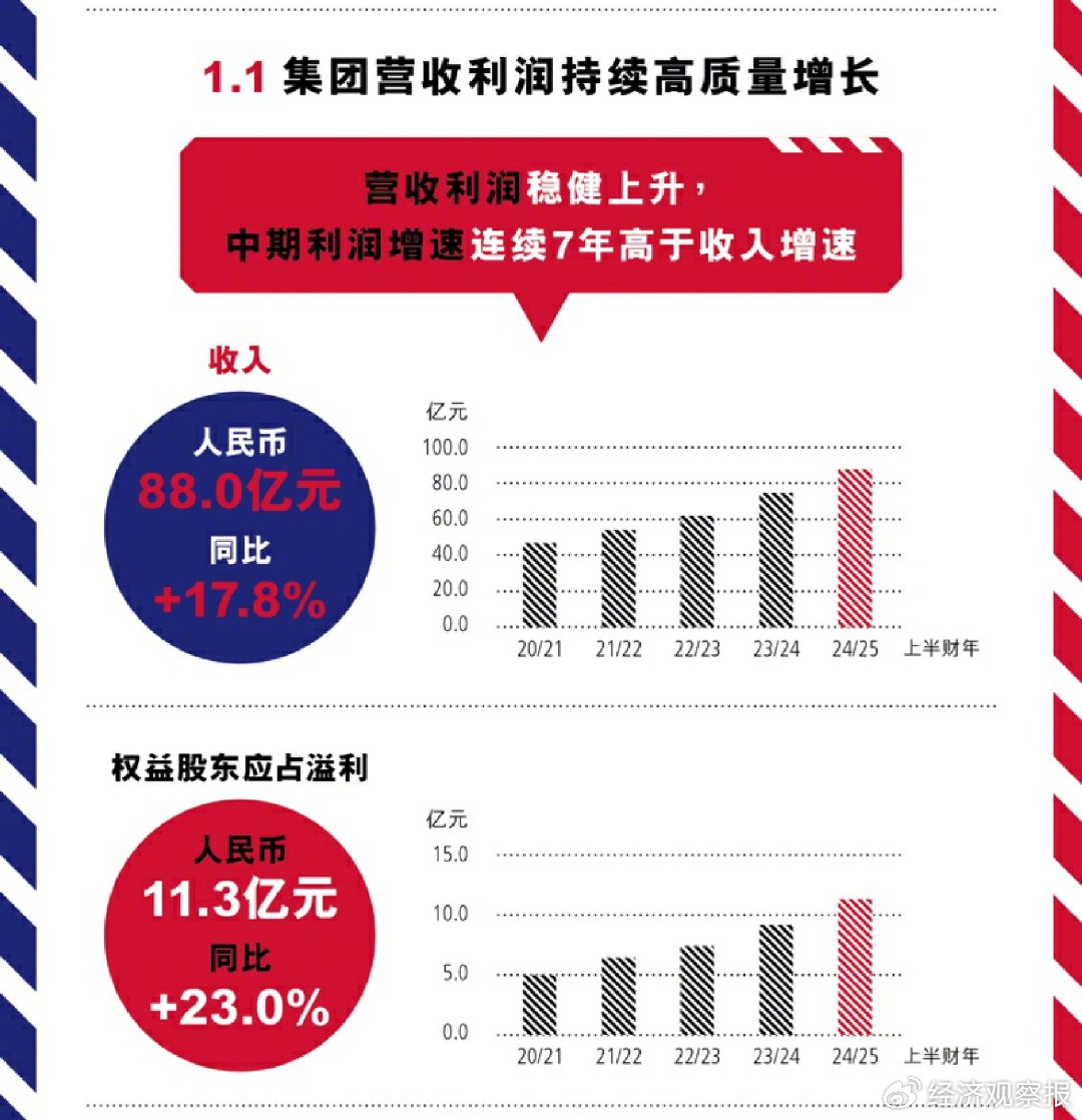 11月28日晚间,波司登负责发布2024/25中期论说。财报表露,2024/25上半财年集团营收完结88.0亿元,筹画溢利上涨19.6%至东谈主民币14.7亿元,筹画溢利率加多0.2个百分点至16.7%,陆续安祥高质地增长,充分展现了波司登行为行业龙头的韧性。