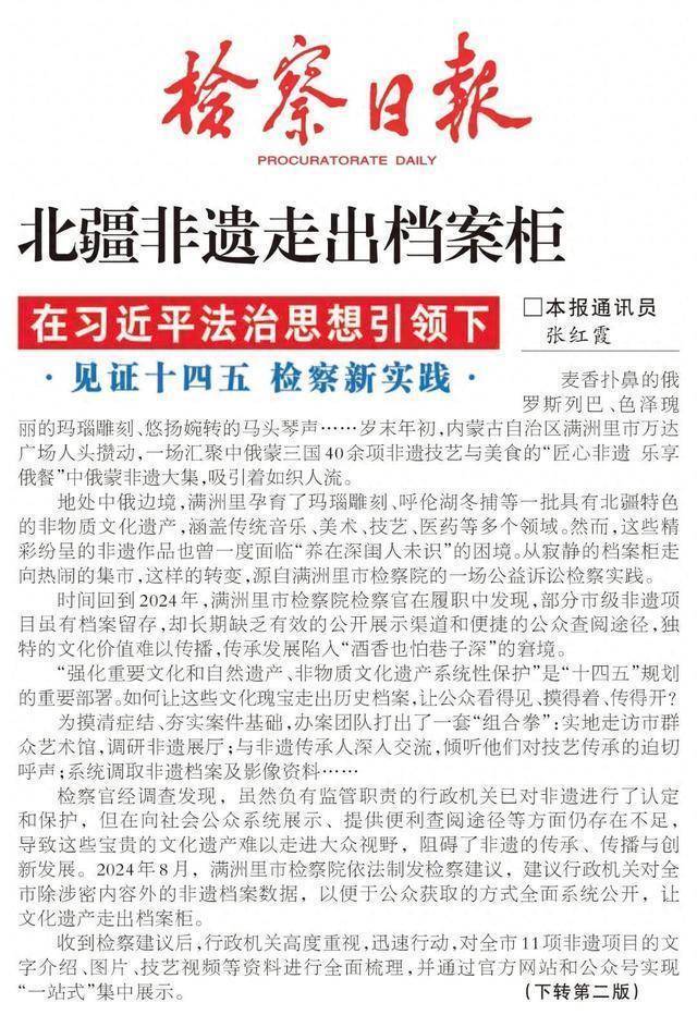 地处中俄边境,满洲里滋长了玛瑙雕镂、呼伦湖冬捕等一批具有北疆特质的非物资文化遗产,涵盖传统音乐、好意思术、武艺、医药等多个鸿沟。但是,这些精彩纷呈的非遗作品曾经一度濒临“养在深闺东说念主未识”的困境。从寂然的档案柜走向干与的集市,这么的振荡,源自重洲里市稽查院的一场公益诉讼稽查实施。