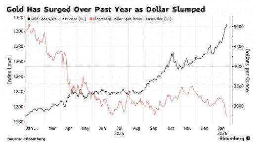 周二,黄金价钱迎来七日连涨,此前在周一初次站上每盎司5000好意思元关隘。曩昔12个月,外洋金价飙升85%,而好意思元指数同时下落8.5%。