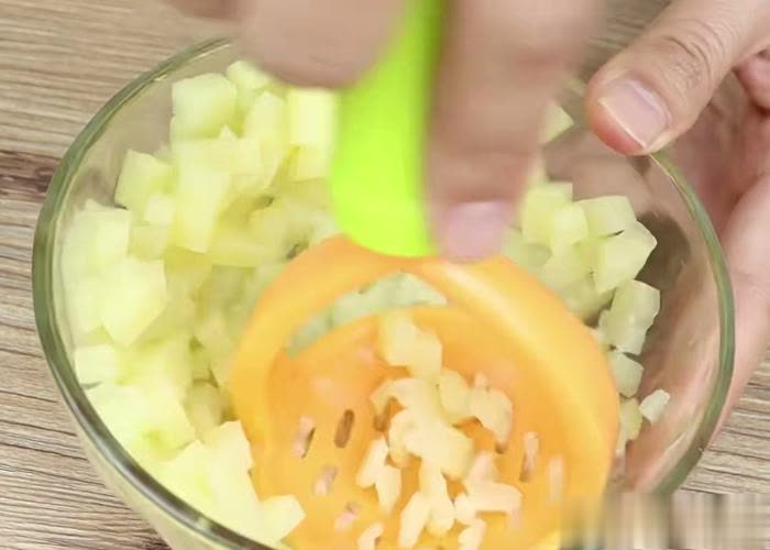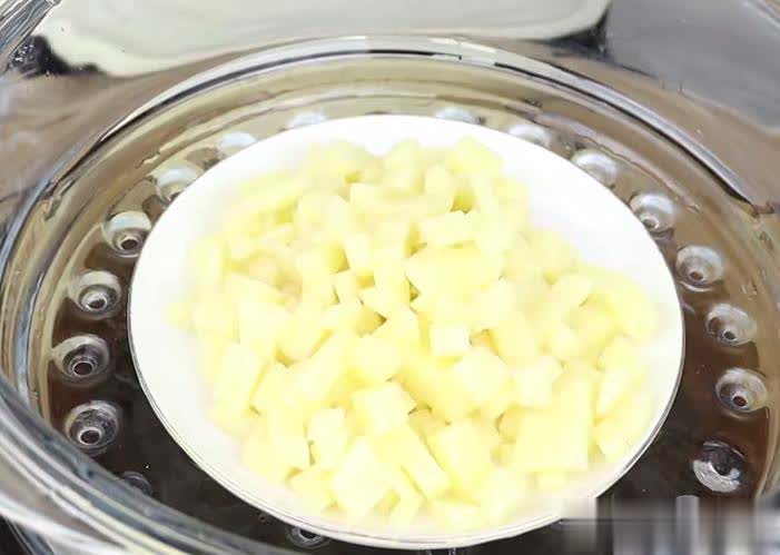 第一步:最初咱们把土豆去皮切成丁,放入一个碗中,上蒸锅大火蒸18分钟。