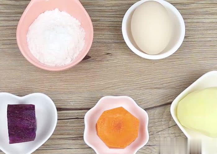 【食材准备】:土豆两个,紫薯和胡萝卜各1个,鸡蛋两个,中筋面粉45克,白砂糖5克,纯牛奶少许。