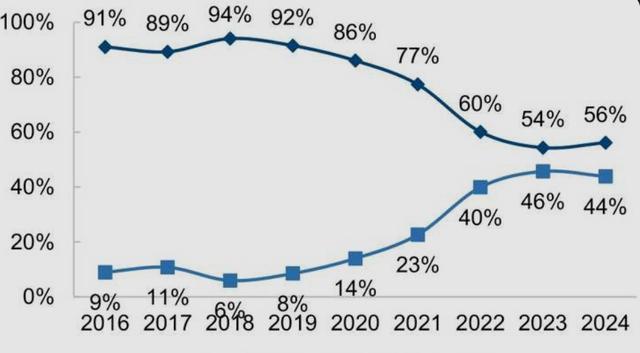 茅台2024年直销经销分辩为44%、56%