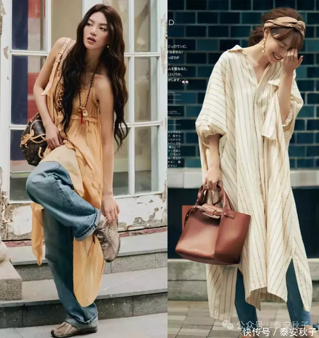 比如左图中好意思女穿的吊带连衣裙,属于纯欲风的一类。下身穿的牛仔裤,又是失业风的一种。