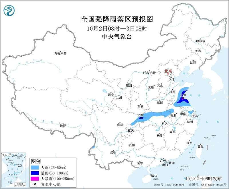 中央表象台10月2日06时持续发布强对流天气、大风、暴雨蓝色预警: