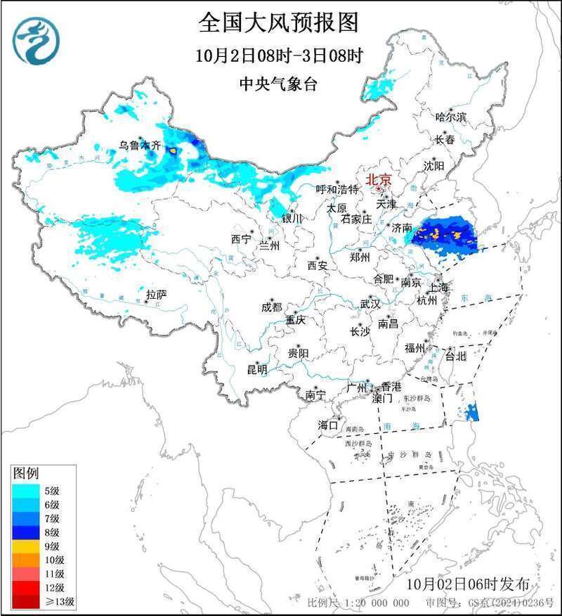 瞻望,10月2日08时至3日08时,新疆北部和东部、甘肃西部、内蒙古西部和东北部等地部分地区有5~6级风,新疆山口地区风力可达7~8级,阵风9~11级;黄海中部和南部海域将有7~8级、阵风9~10级的大风,部分海域风力可达9级、阵风10~11级。巴士海峡东南部将有7级,阵风8级的大风。