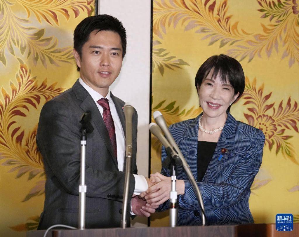 10月20日凯时体育游戏app平台,在位于日本东京的日本国会,日本自民党总裁高市早苗(右)与维新会党首吉村洋文在记者会上执手。新华社/共同社